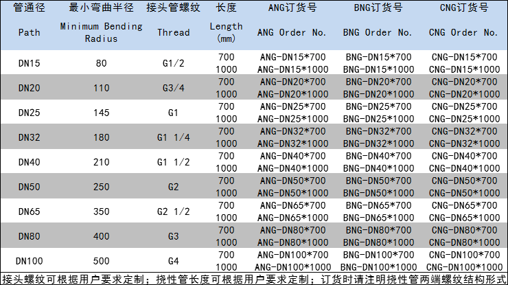 産品種類:PVC橡膠護套(ANG),鋼絲增小少強橡膠護套(BNG),不鏽鋼(CNG)